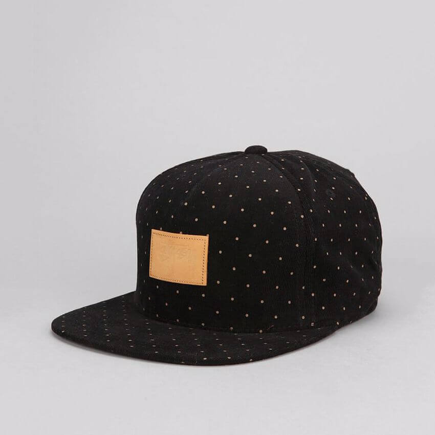 Printed poplin 5 panel camp hat with debossed leather patch and web closure